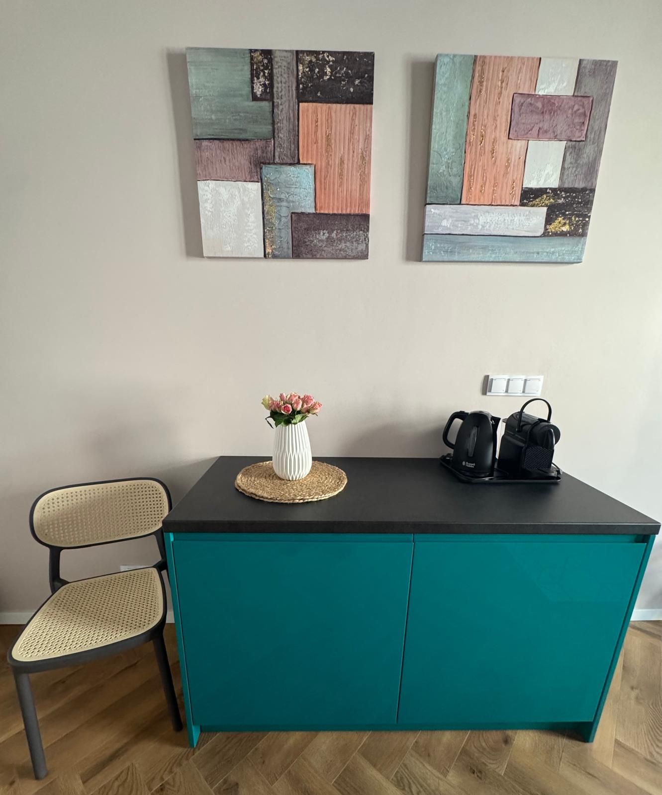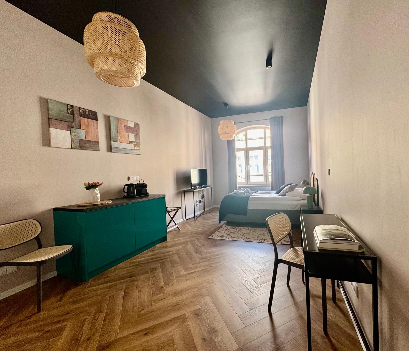 Stylowy, przytulny apartament; idealny dla par. W apartamencie znajduje się wygodne łóżko małżeńskie, łazienka z prysznicem oraz niewielka lodówka. To doskonały wybór dla osób, które stawiają na komfort snu i spędzanie czasu poza apartamentem. Udogodnienia takie jak TV, ekspres do kawy czy Wi-Fi czynią pobyt przyjemnym i bezproblemowym. Widok z okien prowadzi na urokliwy deptak z kamienicami.