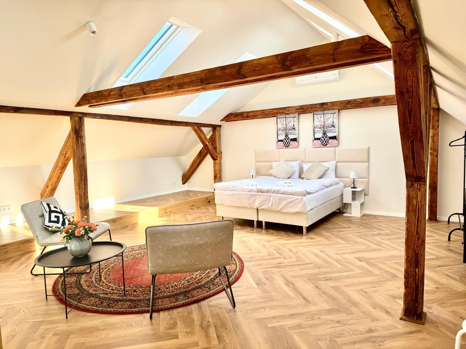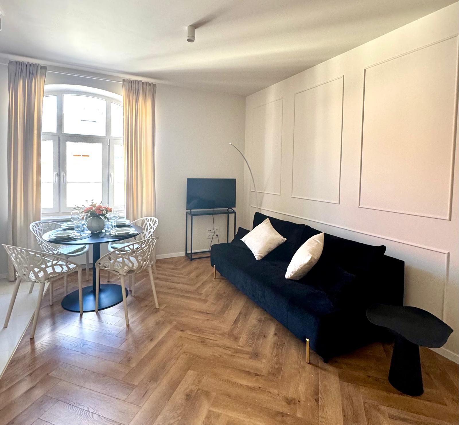 Dwupoziomowy apartament o powierzchni 58 m², idealny dla 2–4 osób. Na pierwszym poziomie znajduje się rozkładana sofa oraz aneks kuchenny, a na drugim – dwa łóżka pojedyncze z możliwością złączenia. Wnętrze jest nowoczesne i klimatyzowane, co zapewnia komfort przez cały rok. Łazienka z prysznicem, telewizor, ekspres na kapsułki oraz szybkie Wi-Fi. Z okien rozpościera się widok na urokliwy deptak i kamienice. To przestrzeń idealna dla rodzin lub grup znajomych, którzy chcą spędzić czas razem, nie rezygnując z wygody.